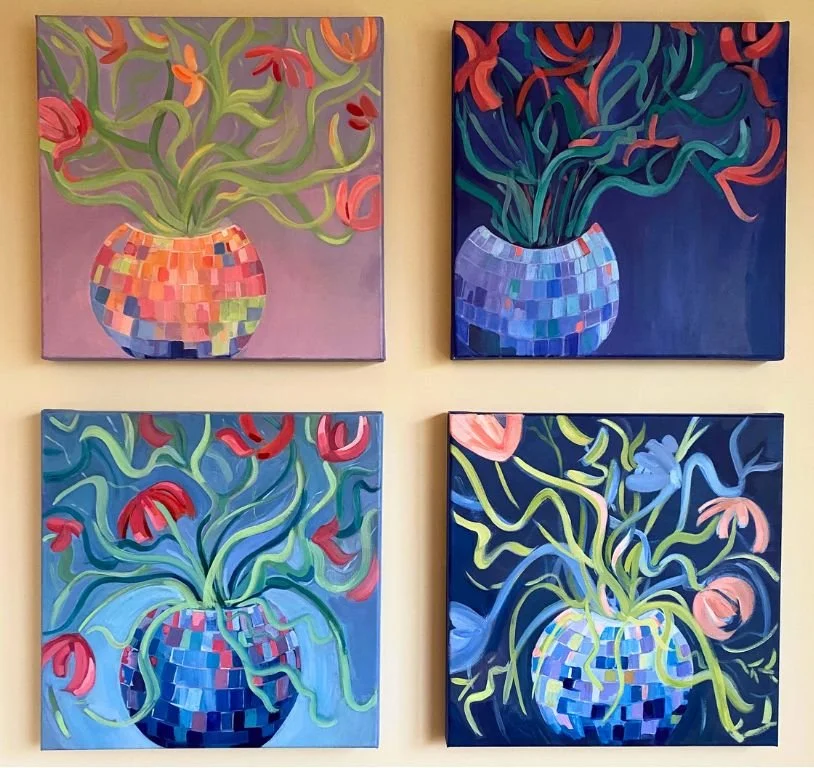 The Disco Flowers series is inspired by disco light, flowers in motion, and colours that shift from dusk till dawn. Each painting captures a sense of rhythm and flow, designed to bring energy into everyday spaces